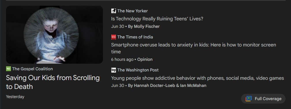 The small text above each headline notes the news site that’s publishing the story. The biggest headline is “Saving Our Kids from Scrolling to Death.” That provokes fear and anxiety! Check out the other headlines and their sources. Do you recognize those news sites, and perhaps, their biases?